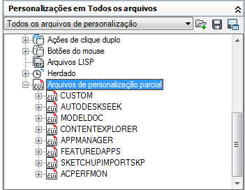 O painel Personalizações em é usado para navegar pelos diferentes elementos da interface do usuário que estão nos arquivos de personalização carregados.