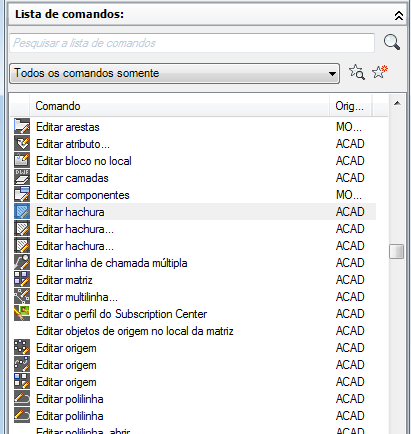 Na parte superior do painel Lista de comandos está a caixa Pesquisar lista de comandos, que permite filtrar a Lista de comandos com base na sequência de texto inserida. A sequência de texto é comparada com qualquer parte de um nome de comando e os resultados são exibidos na caixa Lista de comandos.
