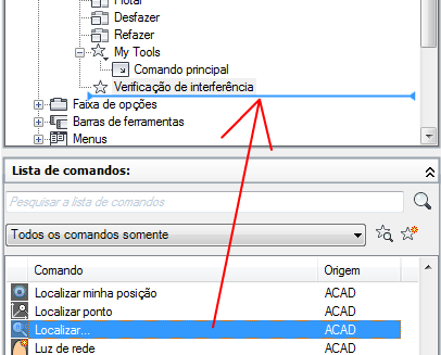 - No painel Lista de comandos, arraste o comando ou o controle que deseja adicionar ao menu suspenso no painel Personalizações em nome do arquivo>.