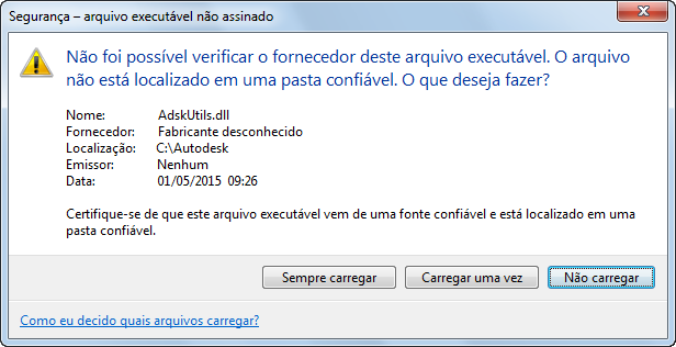 Ao carregar um arquivo de programa personalizado que foi assinado digitalmente, o programa com base no AutoCAD verifica a assinatura digital anexada ao arquivo. Uma caixa de mensagem é exibida, se a assinatura digital puder ser verificada, que permite ao usuário carregar ou não o arquivo do programa no ambiente de desenho.