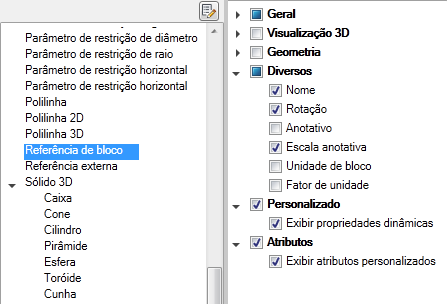 Quando as categorias Personalizado e Atributos estiverem marcadas, as propriedades dinâmicas e os atributos de um bloco serão exibidos na paleta Propriedades rápidas.