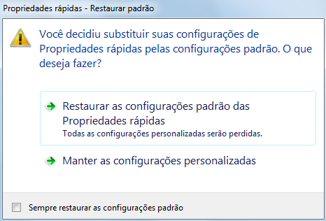 - Clique em Restaurar as configurações de propriedades rápidas padrão.
