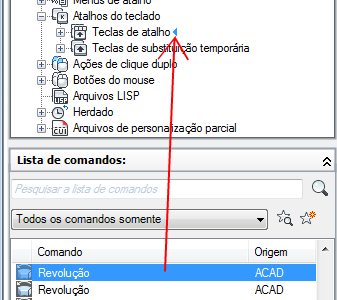- Para criar uma tecla de atalho, no painel Lista de comandos, arraste um comando para o nó Teclas de atalho, no painel Personalizações em <nome do arquivo>.