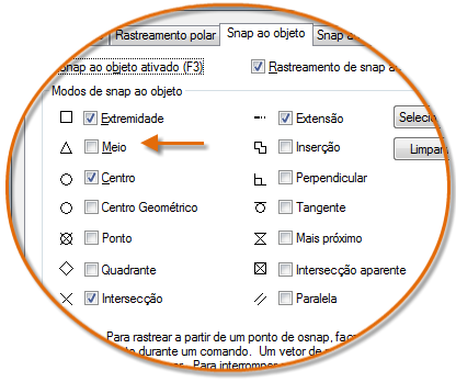 Insira o comando OSNAP para definir os snaps ao objeto padrão, que também são denominados snaps a objeto "em execução". Por exemplo, talvez você ache útil ativar Snap a objeto do meio por padrão.