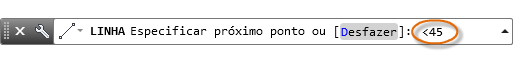 Para desenhar uma linha em um ângulo especificado, é possível bloquear o ângulo para o próximo ponto. Por exemplo, se o segundo ponto de uma linha precisar ser criado com um ângulo de 45 graus, insira <45 na janela Comando.