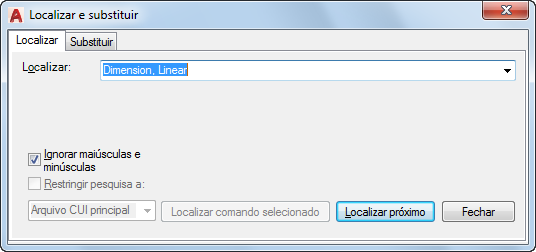 Localiza e substitui comandos ou propriedades de comandos (nomes de comandos, descrições ou macros). Use a guia Localizar para localizar uma sequência de texto especificada e a guia Substituir para localizar e substituir a sequência de texto especificada.