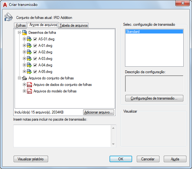 Exibe informações de relatório incluídas no pacote de transmissão. Inclui anotações sobre transmissão inseridas e anotações sobre distribuição geradas automaticamente que apresentam detalhes das etapas a serem seguidas para o correto funcionamento do pacote de transmissão. Por exemplo, se as fontes SHX são detectadas em um dos desenhos de transmissão, você será instruído sobre onde copiar estes arquivos para que eles possam ser detectados no sistema onde o pacote de transmissão está sendo instalado. Se você criou um arquivo de texto com anotações padrão, elas também serão incluídas no relatório.
