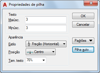 Exibe a caixa de diálogo Propriedades de pilha automática. O recurso Empilhamento automático empilha somente caracteres numéricos imediatamente antes e depois dos caracteres acento circunflexo, barra ou símbolo de libra.