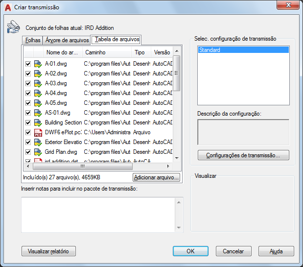 Por padrão, todos os arquivos associados ao desenho atual (como refex, estilos de plotagem e fontes relacionados) são apresentados. Você pode adicionar arquivos ao pacote de transmissão ou remover arquivos existentes. Os arquivos relacionados que são mencionados pelos URLs não são incluídos no pacote de transmissão.