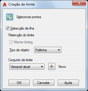 Solicita que você selecione os objetos que definem o conjunto de limite. LIMITE inclui somente os objetos que podem ser usados para criar uma região ou polilinha fechada quando uma nova configuração de limite é construída.