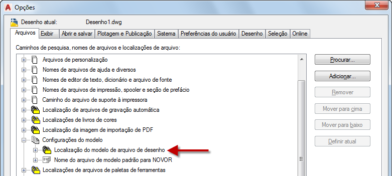 Os arquivos de modelo de desenho (DWT) são usados para criar novos desenhos. Os desenhos criados com um arquivo DWT contêm todos os estilos e objetos de desenho definidos no arquivo DWT. Os arquivos DWT personalizados da versão anterior são migrados para uma subpasta com o nome da versão para a qual eles foram migrados; a convenção de nomenclatura da subpasta é Modelos Nome do produto. A subpasta Modelos Nome do produto é criada na pasta definida pela configuração Localização do arquivo de modelo do desenho.