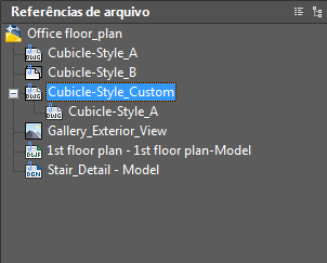 O nível mais alto da vista em árvore mostra o desenho atual. Arquivos referenciados aparecem no próximo nível. Arquivos referenciados que contêm suas próprias referências de arquivos aninhados podem ser abertos para mostrar níveis adicionais. Ao efetuar seleções na vista em árvore, somente uma referência de arquivo pode ser selecionada de cada vez.