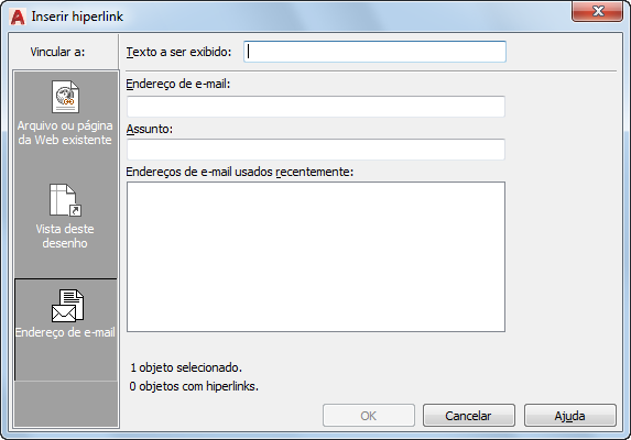 Relaciona os endereços de e-mail utilizados recentemente, que você pode selecionar para utilizar no hiperlink.