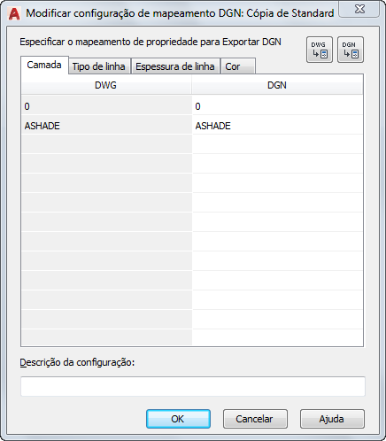 Nova configuração de mapeamento: Se você acessou a caixa de diálogo Modificar a configuração de mapeamento DGN ao criar uma nova configuração de mapeamento partindo das caixas de diálogo Importar/Exportar configurações DGN, as linhas serão preenchidas com todos os níveis definidos do arquivo DGN importado ou todas as camadas definidas no arquivo de desenho atual.