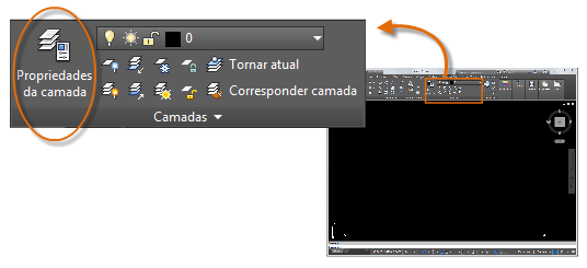 Para ver como um desenho é organizado, utilize o comando CAMADA para abrir o Gerenciador de propriedades de camada. É possível inserir CAMADA ou CA na janela Comando, ou é possível clicar na ferramenta Propriedades da camada, na faixa de opções.