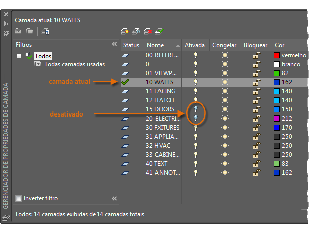 Na coluna marcada como Ativada, observe que os ícones de lâmpada de duas camadas estão escuros. Essas camadas foram desativadas para ocultar as portas e a fiação elétrica na planta de piso.