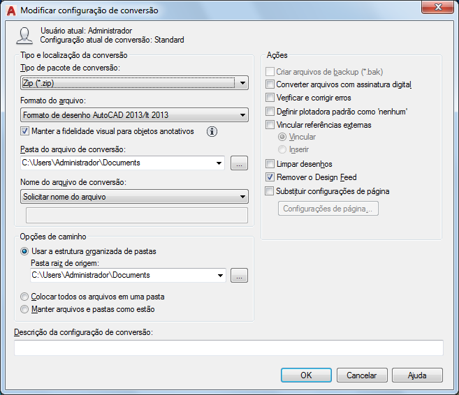 Insira uma descrição para a configuração de conversão. Esta descrição é exibida na caixa de diálogo Conversão DWG e na caixa de diálogo Configurações de conversão, abaixo da lista de configurações de arquivos de conversão. Você pode selecionar qualquer configuração de conversão na lista para exibir sua descrição.
