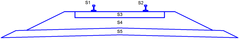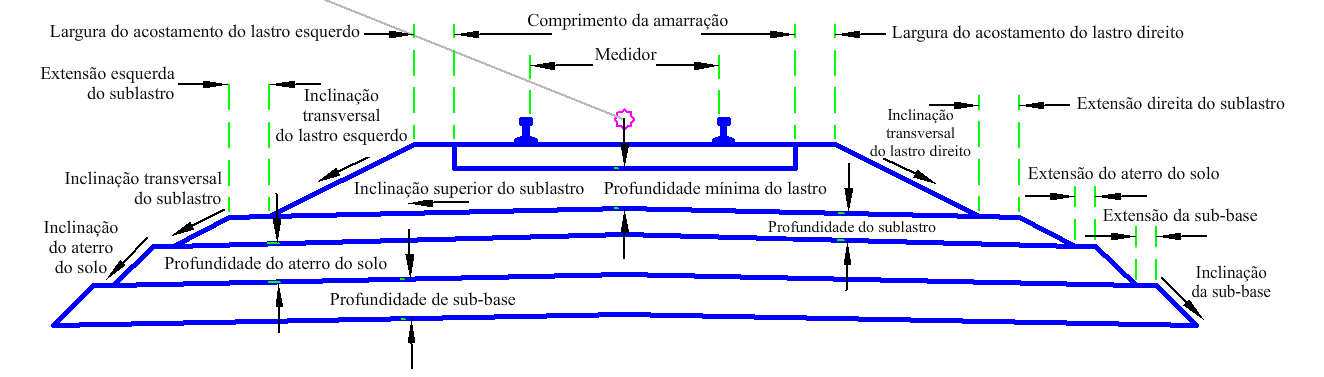 | Extensão do sublastro (esquerda e direita) | A distância desde a parte inferior do material do lastro no início da inclinação lateral do material do sublastro. | Numérico, não negativo |