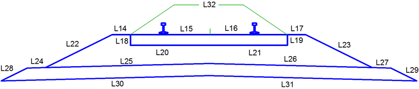 | L32 | Lastro, Ballast_Between_Ties | Material do lastro no espaço aberto entre as amarrações. Também pode ser utilizado onde as amarrações estão omitidas. |