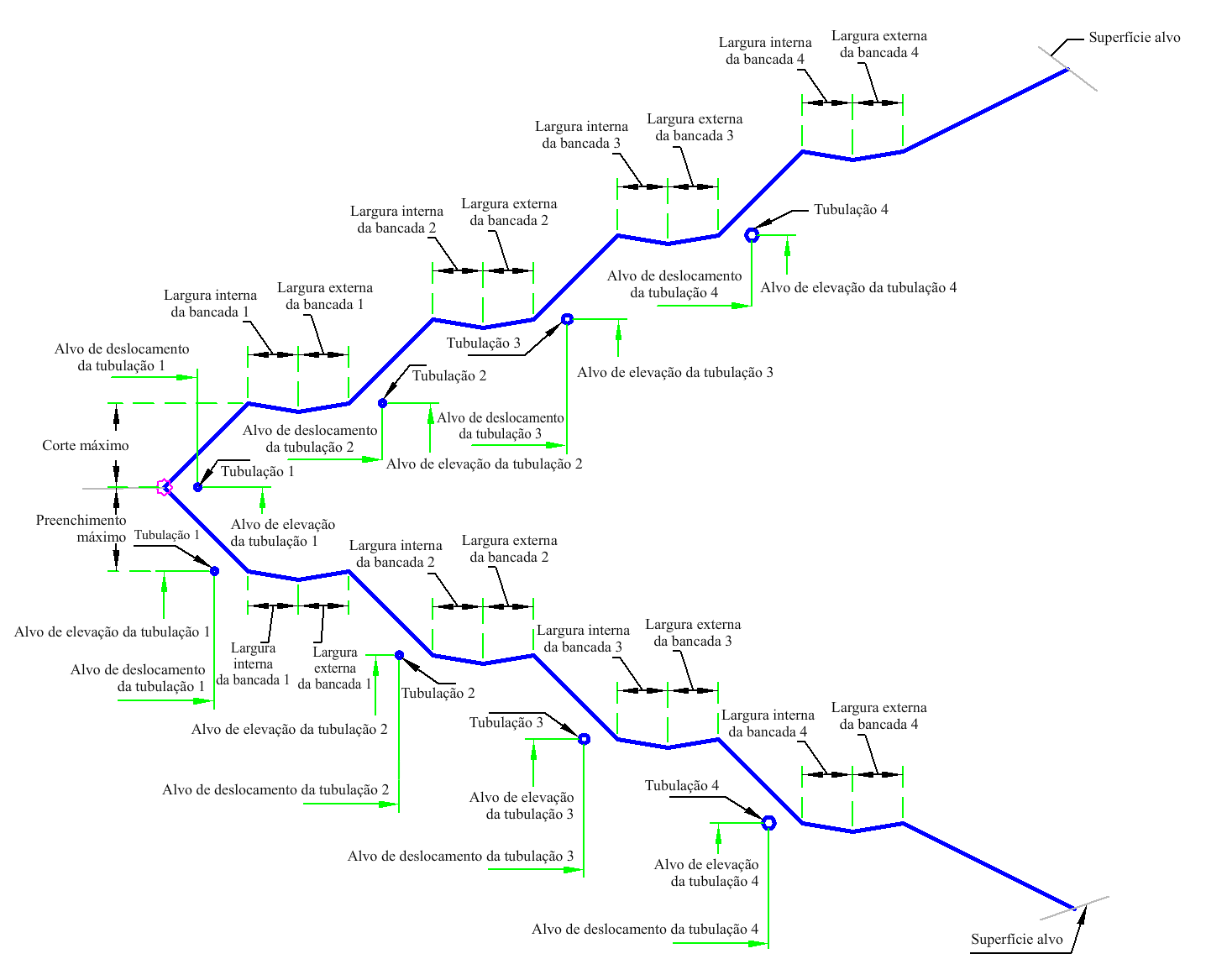 O ponto de articulação inicial é definido no ponto de anexação. A elevação do ponto de articulação é comparada à superfície alvo para determinar se a seção está na condição de corte ou preenchimento. Uma interceptação é calculada para a superfície alvo usando a inclinação do determinado talude. Se a altura para a interceptação exceder a Altura máxima do talude , o vínculo com a Altura máxima da bancada será inserido e a bancada será adicionada. O ponto de articulação é redefinido para a aresta externa da bancada e o processo é repetido até que um vínculo de talude seja encontrado e que não exceda a Altura máxima do talude. Cada bancada, até quatro, utiliza os parâmetros de entrada para cada largura e profundidade da bancada.