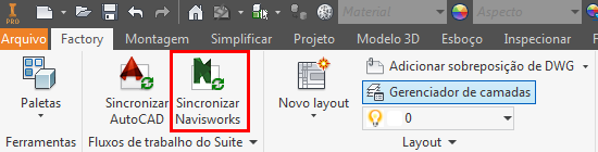 O fluxo de trabalho Sincronizar o Navisworks abre o layout ativo do Inventor no Navisworks. O arquivo da montagem é salvo no formato .nwf para melhor desempenho no ambiente do Navisworks.