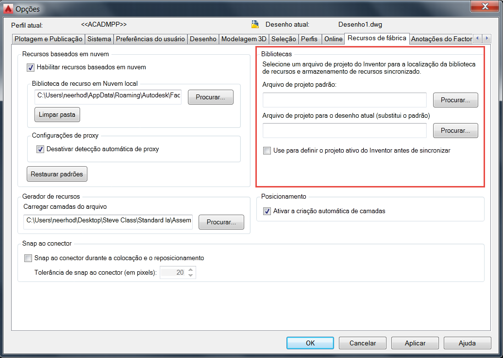 Para compartilhar bibliotecas de recursos entre o AutoCAD e o Inventor, você deve indicar nas configurações de opções do AutoCAD que arquivo de projeto do Inventor deve ser especificado durante a localização de recursos e a sincronização de dados de recursos entre o AutoCAD e o Inventor.