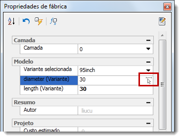 Se um valor de propriedade for derivado de uma expressão de parâmetro chave incluída na definição de propriedades de recurso, você poderá passar o mouse sobre o valor para visualizar a expressão. Por exemplo, "A altura é 70 pol" pode aparecer na descrição do recurso. Passar o mouse sobre o campo mostra que a expressão usada para definir a descrição é "=A altura é <altura>".