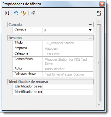 O navegador Propriedades do Factory é preenchido com os dados de parâmetro do recurso quando um recurso parametrizado é selecionado na montagem de layout de fábrica. Se um campo está desabilitado, o valor não pode ser alterado. Se um recurso não está definido para uma categoria, a categoria não é exibida.