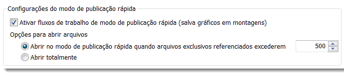 Se ativado, o Modo rápido é executado automaticamente quando um arquivo ultrapassa as configurações de tamanho. Abrir totalmente desativa o Modo rápido e carrega todos os dados de componentes sempre que você abrir um layout.