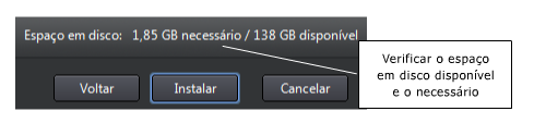 A página Instalar > Configurar e Iniciar Instalação do Instalador mostra a quantidade de espaço em disco necessária para sua instalação e a quantidade disponível de espaço em disco.