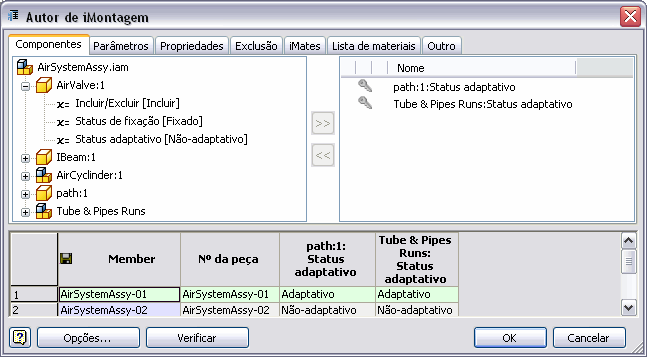 Autor do iPart/iAssembly. É exibido o nome do arquivo da montagem de trechos principais na lista de objetos que é, por padrão, Tube & Pipe Runs. Na tabela de configuração é selecionada automaticamente o status adaptativo.
