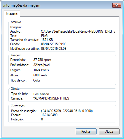 É possível ver o nome, tamanho, densidade, profundidade e tipo do arquivo para uma imagem inserida. Também é possível visualizar a data em que a imagem foi criada e modificada e a camada na qual ela reside.