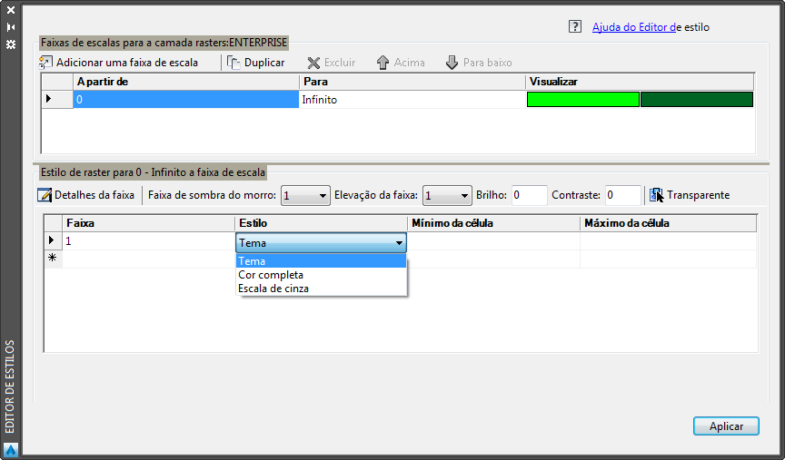 - No Editor de estilo, em Estilo raster para 0 - Faixa de escala infinita, clique na seta para baixo na entrada Estilo. Selecione Tema(mesmo se ele já estiver selecionado).