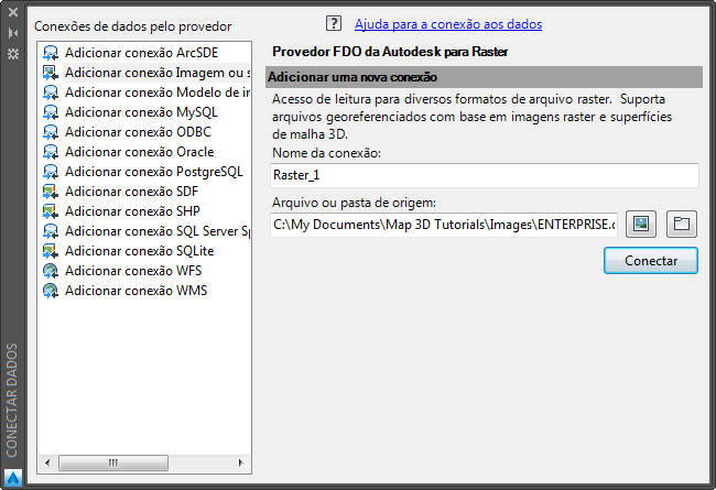 - Na janela Conectar dados, em Conexões de dados por provedor, clique em Adicionar imagem raster ou conexão de superfície e clique em