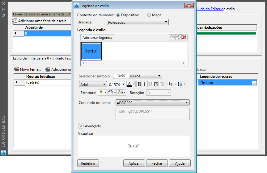 Clique na célula da coluna Legenda do recurso. Especifique a propriedade que deseja exibir na legenda e algumas opções de estilos.
