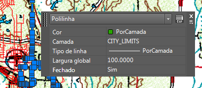 Neste exercício, você altera a largura da polilinha que representa os limites da cidade. Os limites da cidade são exibidos de forma mais proeminente no desenho. A seguir, você corta a imagem para exibir uma parte retangular que enquadra a cidade.