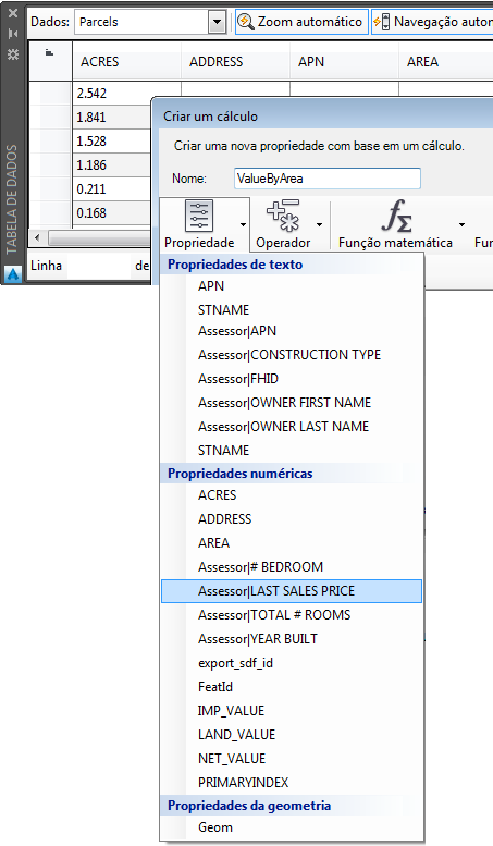 Agora você tem uniu os dados de proprietário à camada de lotes e salvou o resultado em um novo armazenamento de dados. Você pode usar as informações combinadas para criar uma propriedade calculada. A propriedade calculada é o resultado de uma expressão: neste caso, o último preço de vendas dividido pela área.