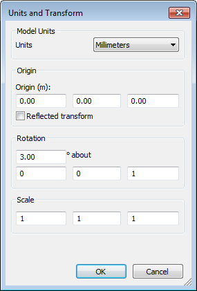 - Para mover a localização do modelo, na caixa de diálogo Units and Transform, na área Origin, insira valores para os eixos X, Y e Z.