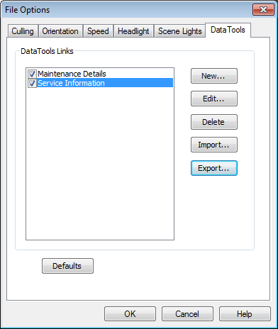 Na caixa de diálogo File Options , guia DataTools , clique no link que deseja exportar na área DataTools Links , e clique no botão Export.
