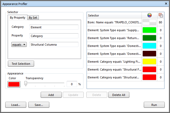 O Appearance Profiler permite definir perfis personalizados de aparência com base em conjuntos (pesquisa e seleção) e valores de propriedade, e usá-los para codificar em cores os objetos no modelo para diferenciar os tipos de sistemas e identificar visualmente seu status. Os perfis de aparência podem ser salvos como arquivos DAT e compartilhados entre outros usuários do Autodesk Navisworks.