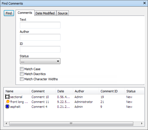 A janela Find Comments é uma janela encaixável que permite pesquisar por comentários e identificadores com base nos dados do comentário (texto, autor, ID do comentário, status), data de modificação do comentário, e a origem do comentário.