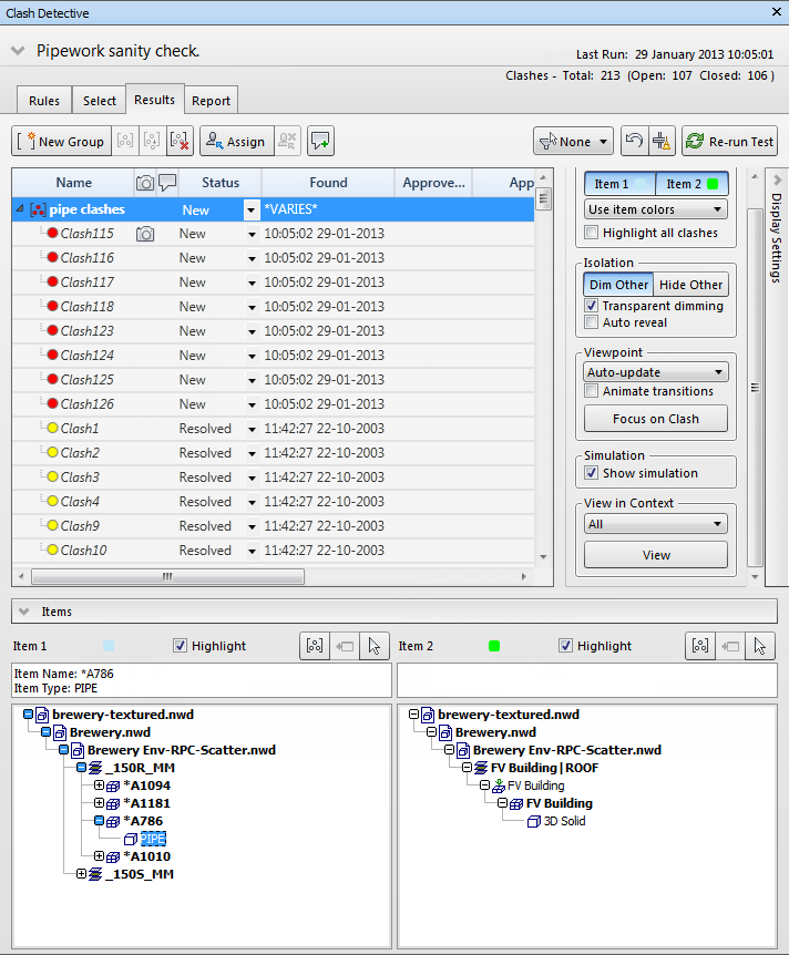 . É possível clicar na seta ao lado de um grupo de interferências para alternar entre exibir e ocultar as interferências contidas no grupo. Finalmente, ao selecionar um item em um dos painéis do painel Items e, em seguida, clicar no botão SwitchBack , envia a vista atual e o objeto selecionado de volta para o pacote de CAD de origem. Isso torna muito simples mostrar as interferências no Autodesk Navisworks, levá-las de volta para o pacote de CAD, alterar o projeto, e a seguir recarregá-las no Autodesk Navisworks, para uma rápida execução de revisão de projeto.