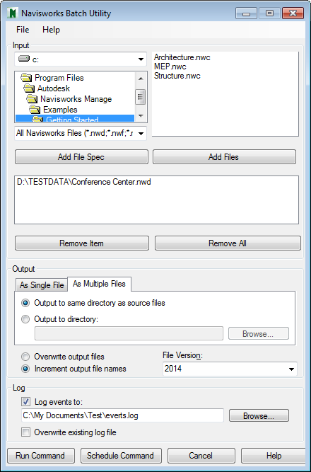 - No Autodesk Navisworks , na caixa de diálogo Batch Utility, use a área Input para criar uma lista de arquivos de projeto para conversão: