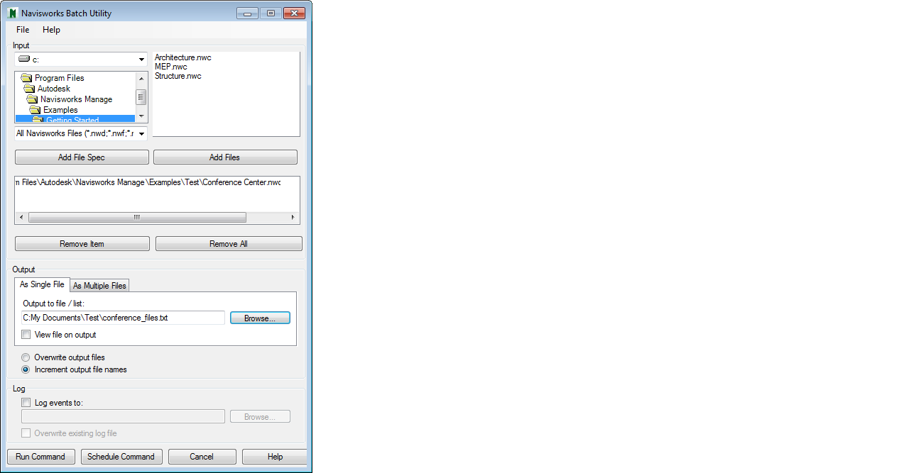- A caixa de diálogo Autodesk Navisworks do Autodesk Navisworks é exibida, e o caminho para o modelo atual é automaticamente adicionado à área Input da caixa de diálogo.