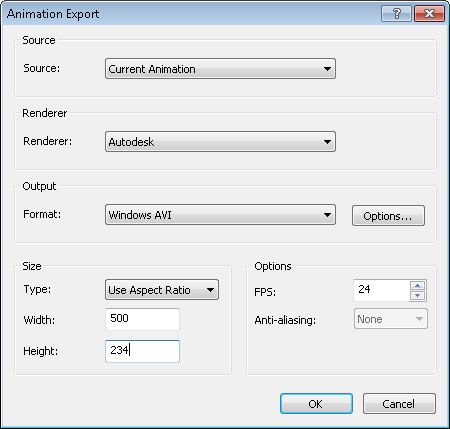 - Defina o resto das caixas na caixa de diálogo Animation Export, e clique em OK. Para obter mais informações, consulte Caixa de diálogo Animation Export.