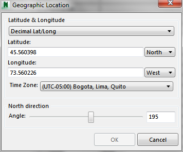 Utilize esta caixa de diálogo para definir a latitude, longitude e a direção norte de uma localização geográfica em seu modelo. A Scene View mostra a posição do sol em fuso horário personalizado.