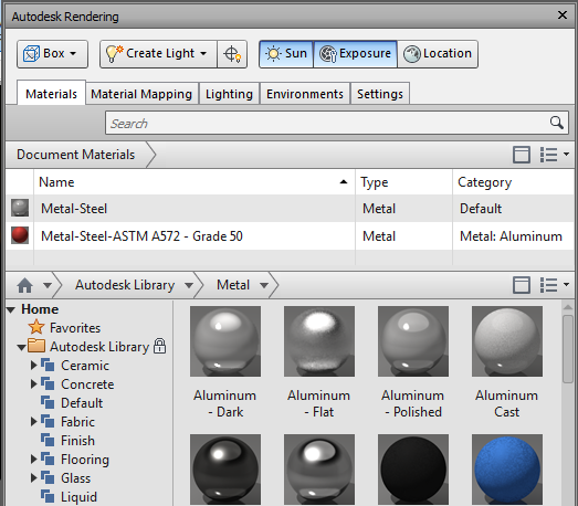 A biblioteca da Autodesk, com mais de 700 materiais e mais de 1.000 texturas, está incluída com o produto. É possível adicionar materiais da Autodesk para seu modelo e editar e salvá-los em sua própria biblioteca. Utilize a janela Autodesk Rendering para navegar e gerenciar materiais da Autodesk e materiais definidos pelo usuário.