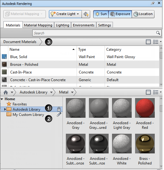 1 - Biblioteca da Autodesk. Contém materiais predefinidos para uso em aplicativos da Autodesk que oferecem suporte a materiais. As bibliotecas fornecidas pela Autodesk são bloqueadas, como é indicado por um ícone de cadeado. Embora você não possa editar a biblioteca da Autodesk, é possível usar este material como base para os materiais personalizados que podem ser salvos na biblioteca de usuário.