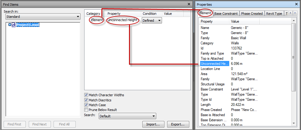 Uma parte importante desse processo é localizar itens com propriedades de modelo específicas na janela Find Items, exportar as propriedades para um arquivo XML e modificá-las para mapear as propriedades do levantamento escolhido. Pode ser útil visualizar as janelas Find Items e Properties lado a lado:
