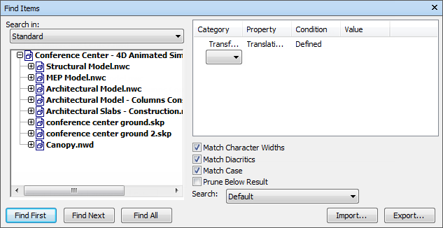 O painel direito permite adicionar as declarações (ou condições) de pesquisa. E os botões permitem encontrar o itens qualificados na cena, e importar e exportar os parâmetros de pesquisa como arquivos XML.